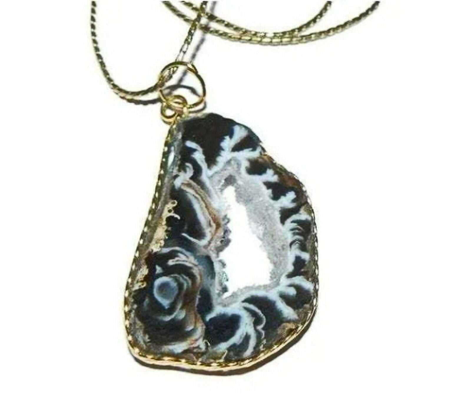 Discover the beauty of our Druzy Geode slice necklace. The stunning stone is set in elegant gold plate metal, exuding a unique and luxurious feel. Its in great condition and adds a touch of elegance to any outfit. Complete your look with this lovely necklace!