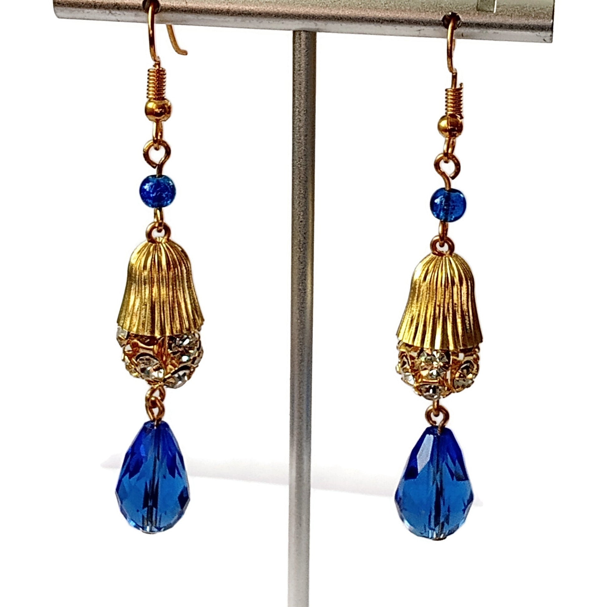Turn heads with our stunning dark blue faceted teardrop earrings. The prong set crystals catch the light for a subtle yet captivating look. Gold-plated ear wires add a touch of elegance. Measures 2-1/2 inches long for a statement-making accessory. Dare to dazzle!