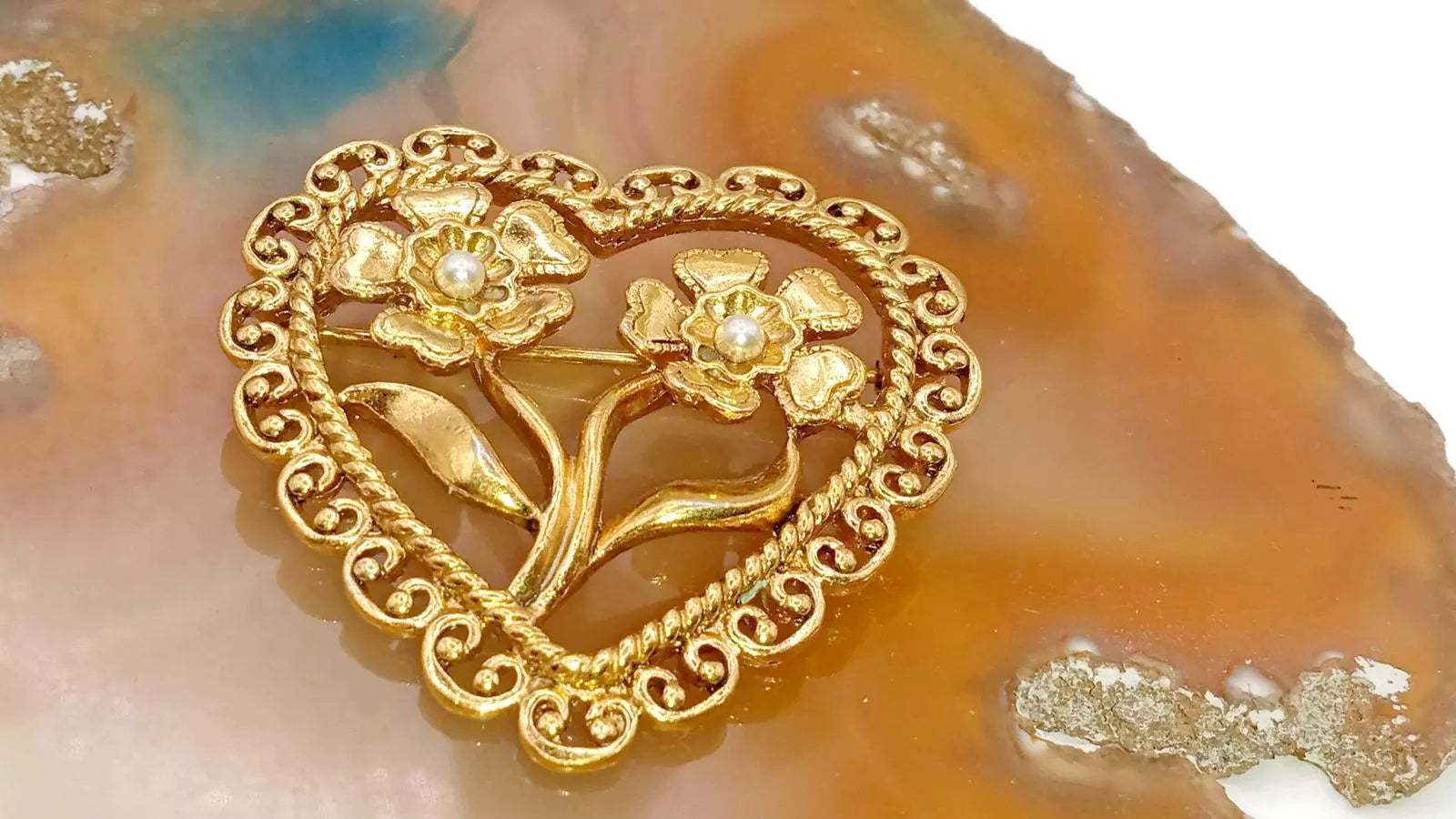 Add a touch of romance to your wardrobe or surprise your loved one with this delicate gold tone brooch. With beautiful openwork details and two lovely flowers inside a heart, it's the perfect piece to show someone you care. Measuring 1-1/2" tall and wide, it's the ideal addition to any outfit.